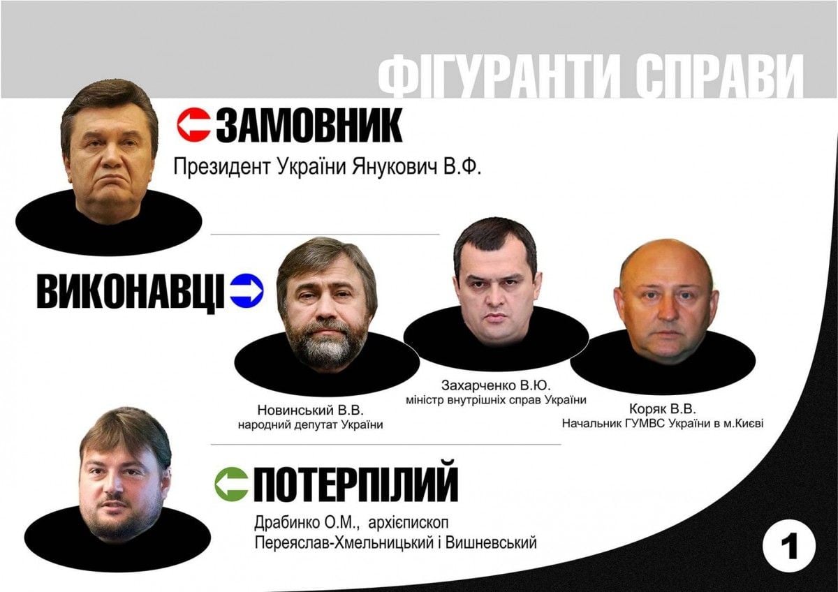 Замовником був екс-президент Віктор Янукович, а виконавцями - нардеп Вадим Новинський , Екс-міністр внутрішніх справ Віталій Захарченко та колишній начальник ГУ МВС України в м.Києві Валерій Коряк. У цій схемі постраждалих став архієпископ Олександр Драбинко.