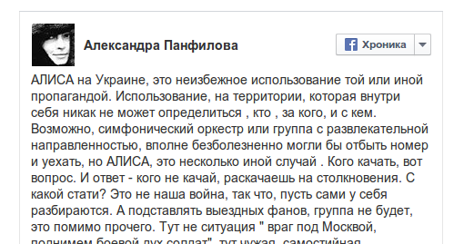 "АЛІСА на Україні, це неминуче використання тієї чи іншої пропагандою. Використання, на території, яка всередині себе ніяк не може визначитися, хто, за кого, і з ким. Можливо, симфонічний оркестр чи група з розважальною спрямованістю, цілком безболісно могли б відбути номер і поїхати, але АЛІСА, це дещо інший випадок. кого качати, ось питання. і відповідь - кого не качай, розгойдати на зіткнення. З якого дива? це не наша війна, так що, нехай самі у себе розбираються. А підставляти виїзних фанів, група не буде, це крім іншого. "
