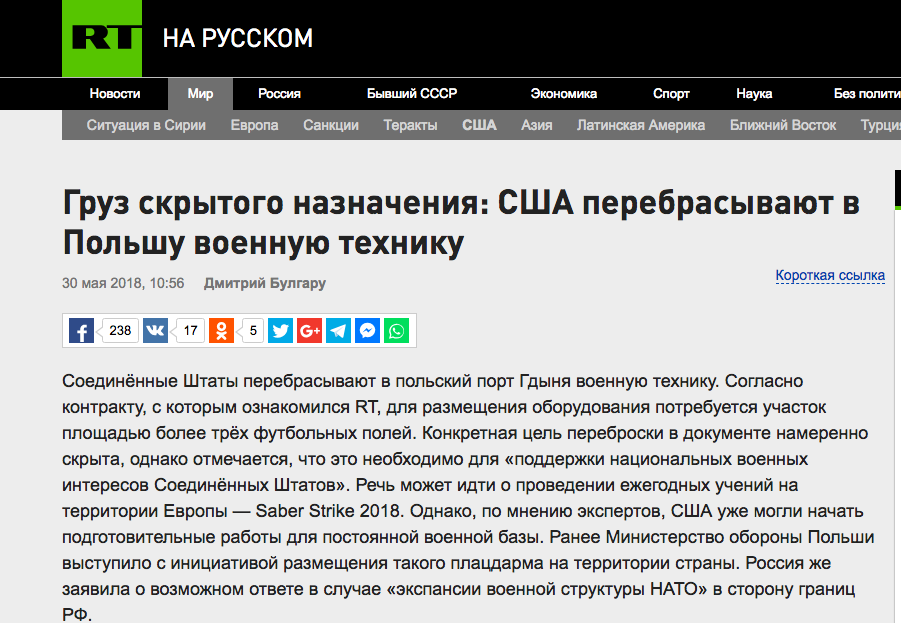 Хвилю маніпуляцій на тему «дестабілізації світу в Європі» російські ЗМІ продовжують і далі. 31 травня на сайті RT російською з'явився матеріал про те, що США масово перекидає військову техніку в Польщу. Декількома днями раніше «підозрілу активність» військ НАТО помітив і глава Міністерства закордонних справ Росії Сергій Лавров .