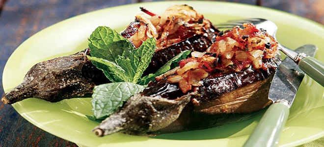 - Одне з найпростіших блюд - баклажани смажені по-турецьки. Для цього баклажан нарізають пластинами і обсмажують. Окремо пасерують морква, цибуля і помідори. Змащують кожну скибочку сумішшю, складають в цілий баклажан, і запікають 20 хвилин при 220 градусах.