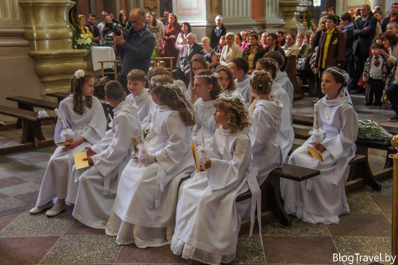 У храмі проводяться служби на латинській, литовською і польською мовами. На одну з них ми теж потрапили і відобразили в своїй пам'яті дитяче виступ в білому одязі.