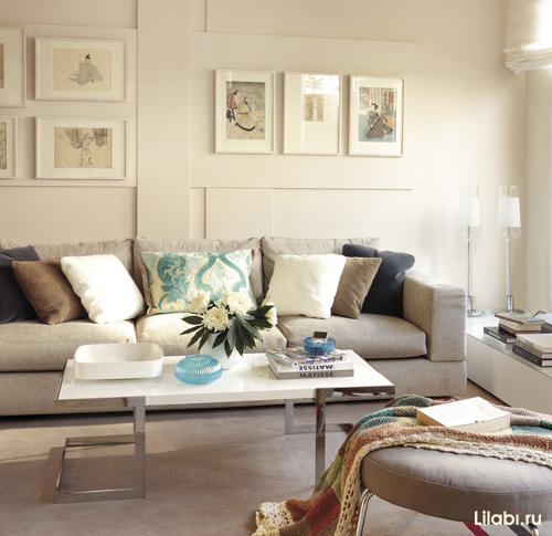 Розбавити такий спокійний інтер'єр допоможуть яскраві акценти у вигляді подушок, штор, оббивки меблів і т.д. Також збільшити простір дозволяють дзеркала. Розсунути межі кімнати візуально допоможуть дзеркальні двері.