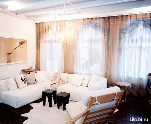 Дизайн вітальні в двокімнатній квартирі буде легким і приємним, якщо використовувати штори з легких світлих кольорів. Важкі гардини обтяжують інтер'єр. Широкий склопакет зробить вітальню просторішою.