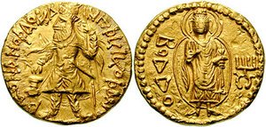 Монета Канишки I - на одній стороні зображений сам імператор, на інший - Будда з написом BODDO на грецькому.
