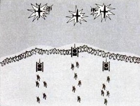 В ІСПАНІЇ танки і піхота Осі проривали оборону (на передньому плані), поки пікіруючі бомбардувальники (на задньому фоні) атакували артилерію; потім танки і піхота спрямовувалися в прорив.