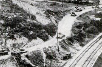 На північнокорейської дорозі стоять російські Т-34, вид з американського літака.