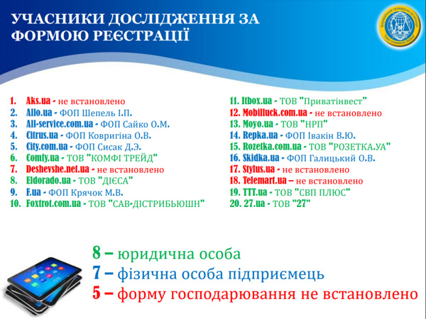 Серед вищевказаних інтернет-магазинів вісім - юрособи, сім - фізичні особи-підприємці.