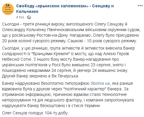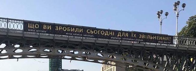 "У цю річницю група активістів і активісток вивісила банер солідарності з" бранцями Кремля "з моста, над Алеєю Героїв Небесної Сотні. З іншого боку моста банер-нагадування про українських політв'язнів в Росії був вивішений 23 серпня, знятий і пошкоджений невідомими 24 серпня, і ввечері 24 вивішений знову. Другий банер звернений в сторону Печерська ", - повідомляють активісти.