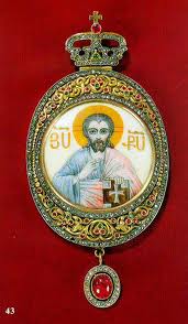- довгий, широкий, стрічкоподібний плат, прикрашений хрестами. Покладається на плечі єпископа таким чином, що, охоплюючи навколо шию, одним кінцем спускається спереду, а іншим ззаду (великий омофор). Без омофора єпископ не може проводити ніякої служби. Омофор надягається поверх сакоса і символізує вівцю, що заблукала і принесену добрим пастирем на плечах в будинок (Лк.15: 4-7), тобто порятунок Ісусом Христом людського роду. А одягнений в нього єпископ зображує собою Христа Доброго Пастиря, який взяв загублену вівцю на плечі і відніс її до заблукав (тобто ангелам) в будинок Отця Небесного. - невеликий круглий образ Спасителя або Божої Матері, прикрашений кольоровими каменями. Носиться на грудях, поверх сакоса.