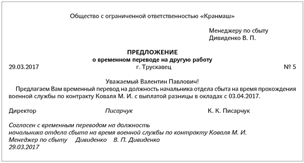 Наведемо приклади пропозиції про тимчасове переведення на іншу роботу і наказу про тимчасове переведення на іншу роботу за згодою працівника.