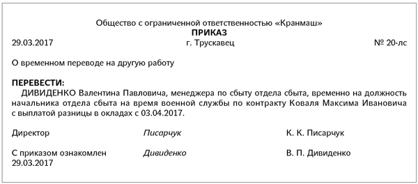 Майте на увазі: в разі тимчасового переведення в наказі вказують термін такого перекладу. При цьому в трудову книжку та особисту картку працівника записів не вносять.